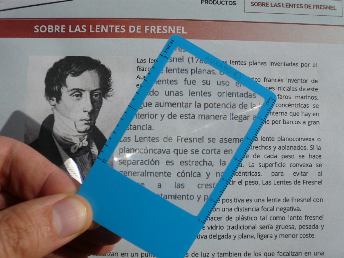 Las Lentes de Fresnel: Son lupas planas del tamaño de tarjetas de visita. Hay diferentes modelos en función del tamaño y disposición de la ventana con la lente de Fresnel. Resulta muy efectiva como tarjeta de visita o tarjeta publicitaria pues resulta útil para el usuario y por su tamaño reducido puede guardarse fácilmente en la cartera/billetera.